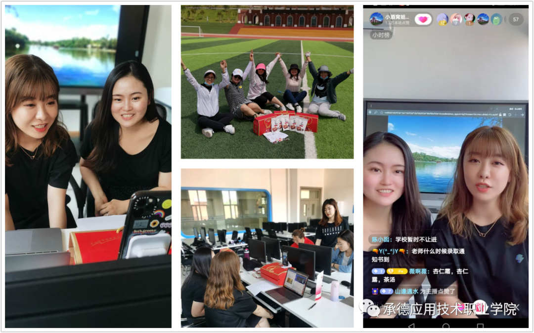 战场上,强调不打无准备之仗,教师直播也一样。直播行业不是一个人做起来的,直播团队的综合实力决定了直播事业的发展空间,摆在我们面前的第一个难题就是如何打造一支既能站住讲台,又能坐住直播间的教师直播团队。快来看看我们的直播准备过程:主播向网红主播学习,钻研如何带货;文案收集商品相关信息,策划脚本制作;摄影师布置拍摄场景,准备各类直播道具;剪辑短视频作品,提前上传抖音空间吸粉。直播过程中,场控及时准备好商品,随时提醒主播在线人数;中控把握上链接节奏,打群公告,解决后台技术问题;副播配合主播及时阅读留言,教授消费者购买方式;客服随时回答在线观众的提问。大家分工负责,团结合作,以“校园回忆杀”和“承德一日游”为主题呈现了两场精彩的直播。