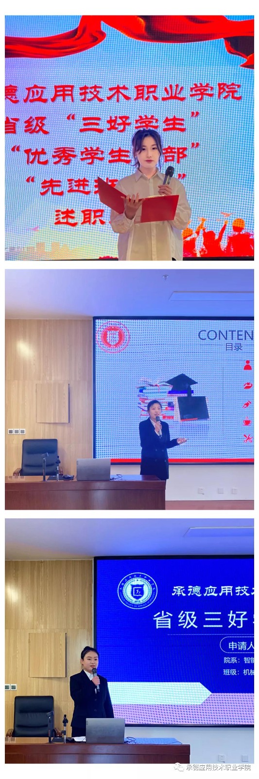 最终,经过评委打分和5个工作日的公示,学前教育系杜雨蒙,智能制造系夏怡、成昊,电子与通信工程系高继兰,商贸管理系丁禹同拟推报省级三好学生;商贸管理系范利华、学前教育系刘畅拟推报省级优秀学生干部;数字媒体应用技术1901班拟推报省级先进班集体。