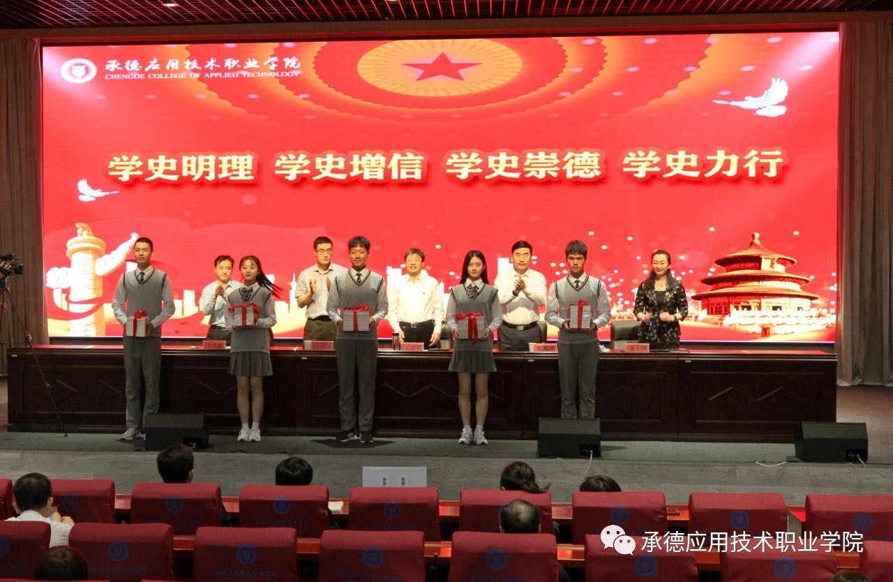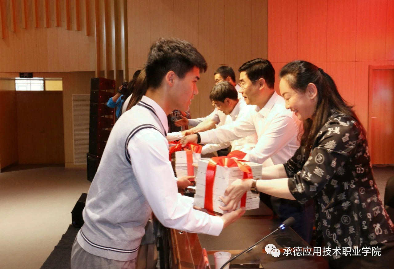 党委书记卜立新在仪式上致辞。他表示,承德市教育局、教育工委组织的“党史进校园”活动启动仪式在我院举行,并把第一节党史教育课送到我院,这是对我院党史学习教育工作的高度重视和大力支持。为开展好“党史进校园”活动,他向全院师生提出三点希望:一是希望师生珍惜这次送党史教育进校园的机会,认真聆听专家讲座,让讲座的内容入心入脑,并深入反思,融会贯通;二是希望通过此次启动仪式,进一步推进学院党史学习教育的深入开展,形成党史学习的高潮;三是希望师生将党史学习与自身工作、学习结合起来,以青春之我、奋斗之我,勇立新时代潮头,做到学史明理、学史增信、学史崇德、学史力行。 启动仪式上,与会领导向学院学生代表赠送了以承德党史为主要内容的书籍,把承德党史送进了校园。