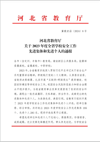 学院获2023年度河北省学校安全工作先进集体