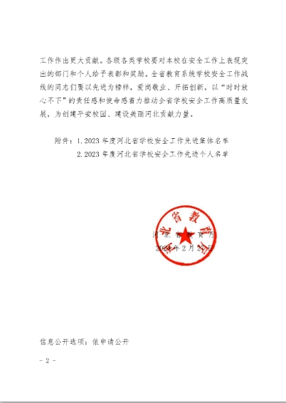 荣获2023年度河北省学校安全工作先进集体称号是学院安全工作的一次重要里程碑,学院将以此为新的起点,继续秉承“安全第一、预防为主”的原则,创新安全工作机制和方法,为打造更加安全、稳定、和谐的校园环境而不懈奋斗。