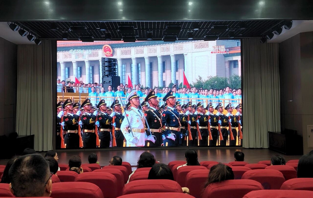 当国旗护卫队迈着铿锵有力的步伐护卫五星红旗进场时,全体师生自发起立,向荧幕中的五星红旗行注目礼。在整个观看过程中,师生们全神贯注,时而为受阅部队整齐划一的步伐鼓掌赞叹,时而为现代化武器装备的亮相感到自豪。师生们始终保持高昂的热情,并用手机不时地拍摄下难忘瞬间。