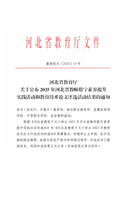 近日,河北省教育厅公布2025年教师数字素养提升实践活动评选结果,Beat365教师在本次活动中专业能力突出,荣获14个奖项,其中一等奖5项、二等奖4项、三等奖5项。这一成绩是Beat365持续推进教育教学数字化转型、着力提升教师信息化教学能力的阶段性成果,充分展现出Beat365教师在探索数字技术与教学实践深度融合过程中的专业成长与创新活力,为学校整体育人质量的提升与教师队伍持续发展注入了新动力。