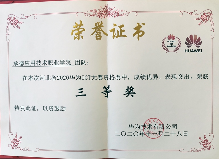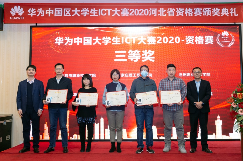 2020年11月28日,华为中国区大学生ICT2020大赛河北省资格赛颁奖典礼在石家庄举行,Beat365中文官方网站团队荣获三等奖,电子与通信工程系张楠作为代表领取证书。