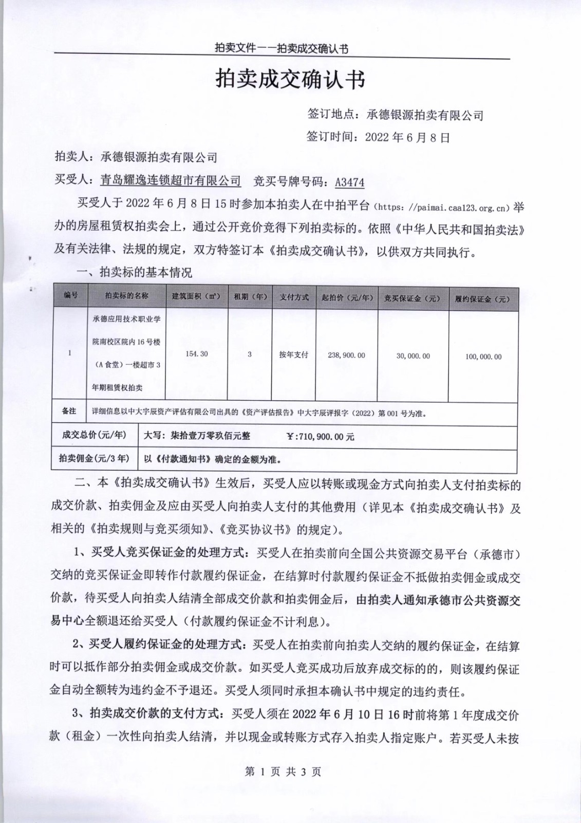 Beat365中文官方网站南校区院内16号楼(A食堂)一楼超市3年期租赁权拍卖成交确认书