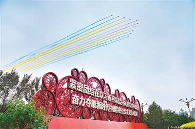2021年7月1日,庆祝中国共产党成立100周年大会在北京天安门广场隆重举行。图为飞行编队飞过北京上空。 (图片来源:人民视觉)