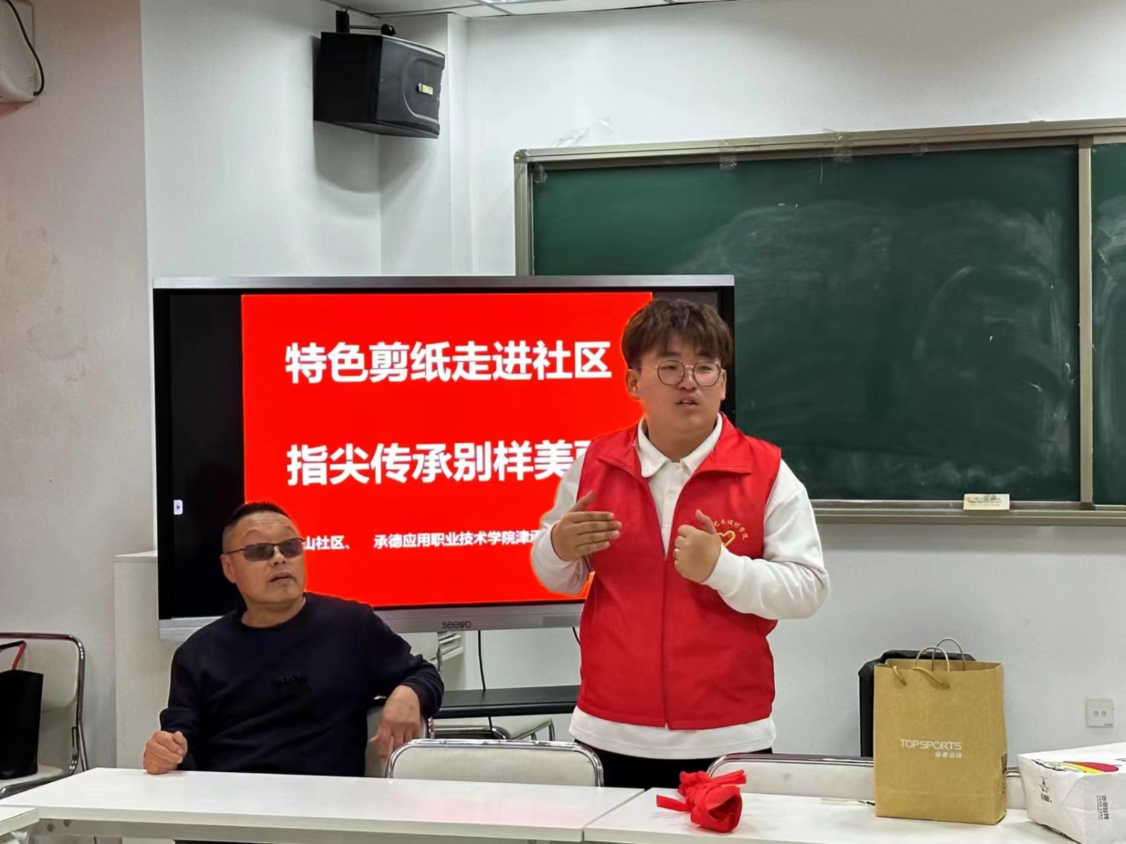 活动中,克非老师向居民们讲解了剪纸的分类、题材、常用剪纸方法等知识,并以五福临门为主题,从折纸、标记线条、比例控制、运刀技巧等方面手把手地指导居民剪出满意的艺术作品。津承艺术设计系学管主任吴迪主任与南山社区书记尹雯婷书记交流剪纸课程安排和今后非遗文化课程。