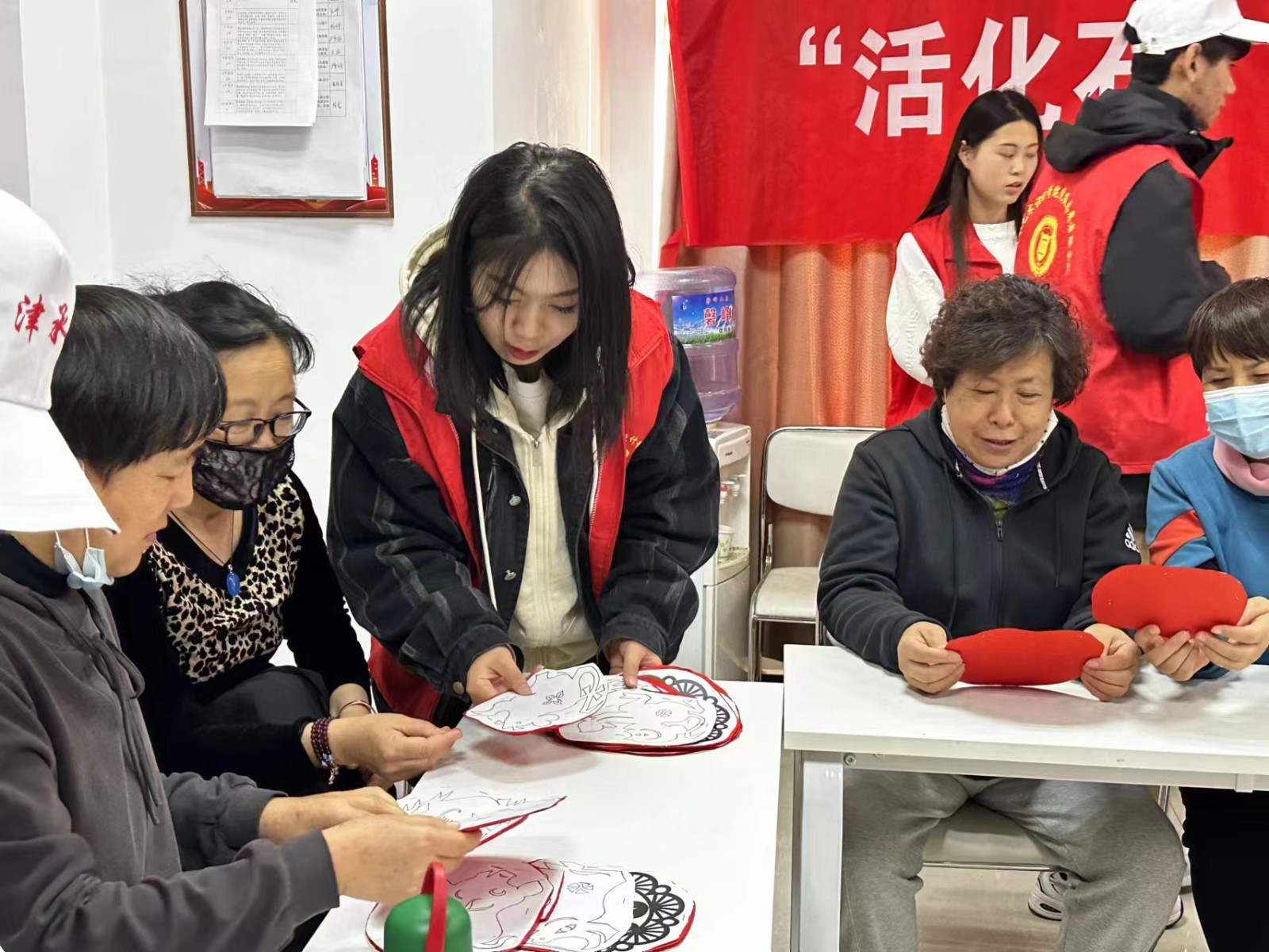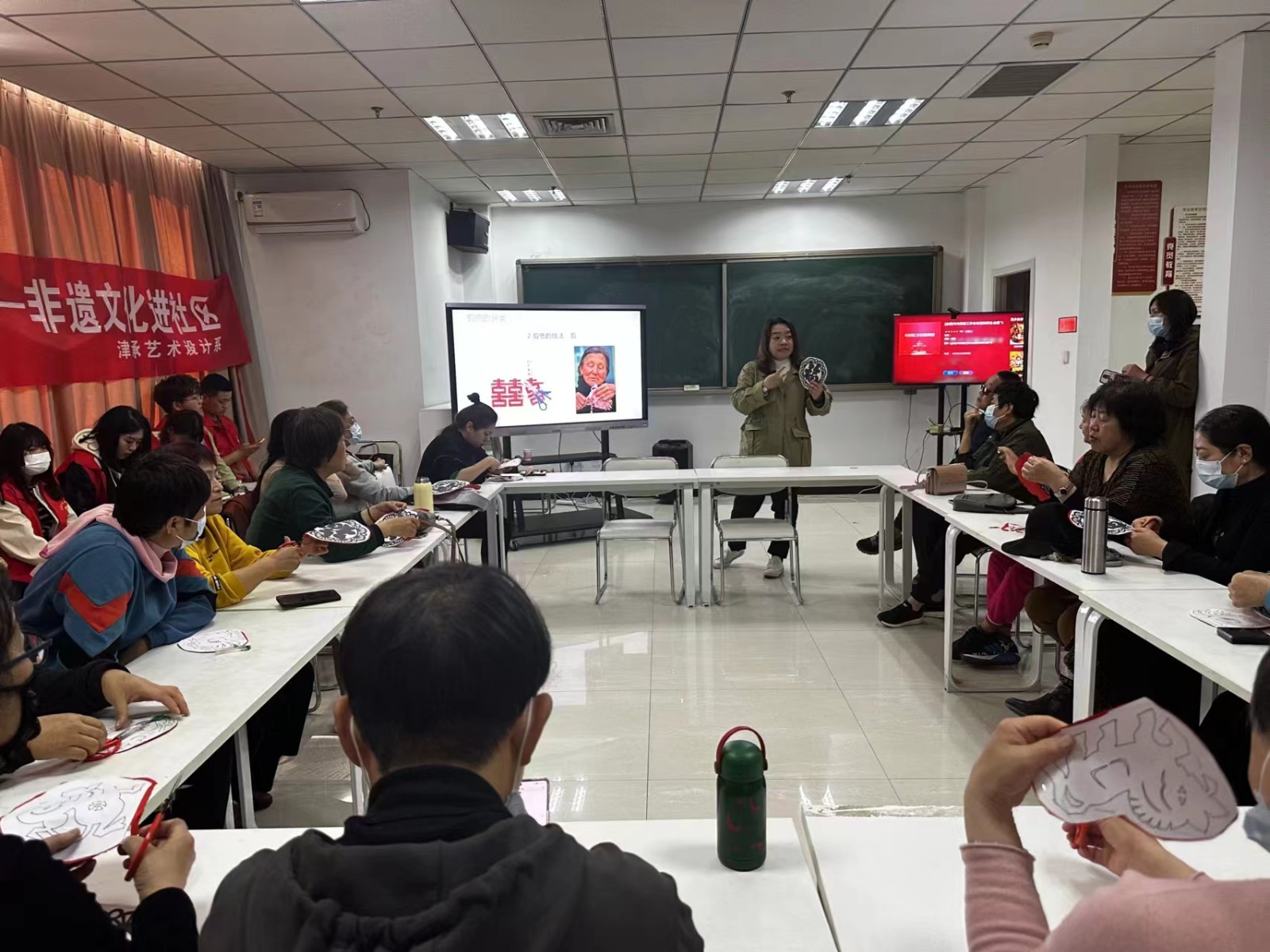 此次活动邀请了津承艺术设计系克非老师为居民们讲解剪纸艺术,并现场展示剪纸技艺,让现场参与者感受了优秀传统文化的魅力。