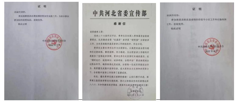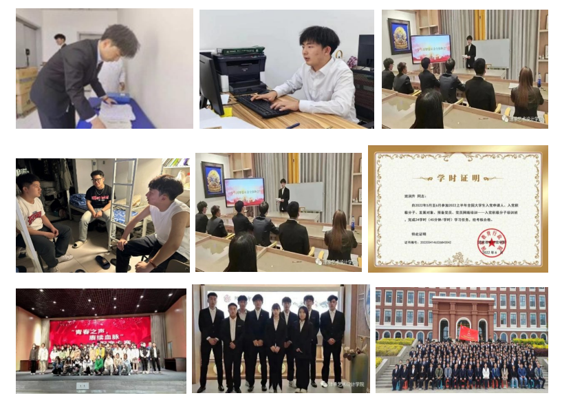 2021学期在校园艺术节绘画比赛中荣获学院一等奖。2021年疫荣获抗疫服务优秀青年志愿者称号。2022年在“多彩青春 绘声绘色”绘画作品大赛中荣获优秀奖。2022年参与北京冬奥会和冬残奥会志愿者荣获优学员证书。2022年6月返市,在张家口疫情防控工作中,荣获最美志愿者称号。2022年7月初参加张家口市疫情防控宣传实践工作,为家乡地区普及防控疫情知识。2022年7月中旬配合当地统计局进行人口普查工作,荣获新青年优秀标兵.2022年8月自愿前往一线,参加张家口市疫情防控工作和后勤保障工作。2022年9月参加张家口市高速疫情防疫站工作,荣获青年志愿者称号。2022年10月参加了学院组织的党的二十大进“走基层”“进校园”分团宣讲。