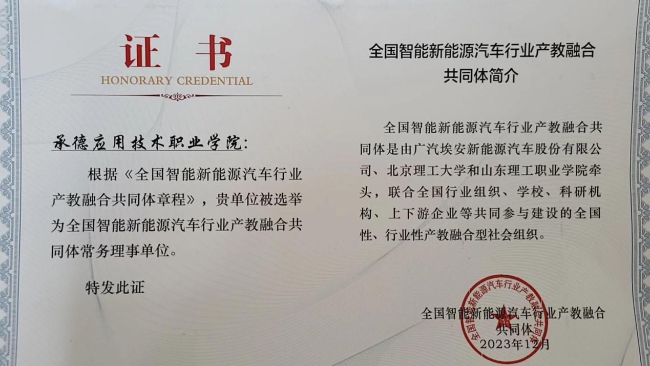 2023年12月27日,全国智能新能源汽车行业产教融合共同体成立大会在广州广汽埃安新能源汽车股份有限公司成功举行。Beat365中文官方网站当选全国智能新能源汽车行业产教融合共同体的常务理事单位,承德工业学校当选为理事单位。