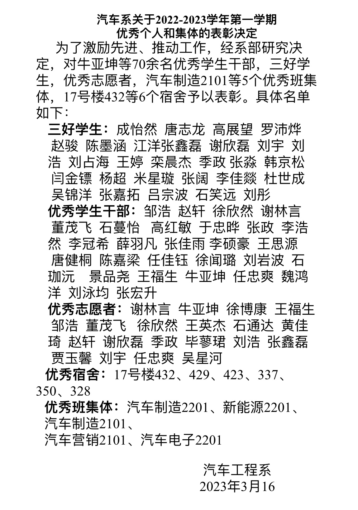 通过本次表彰,给同学们鼓舞了干劲,希望受到表彰的同学戒骄戒躁,取得更大努力;也望全体学生干部恪尽职守、尽职尽责,为系部高质量发展做出更大的贡献!