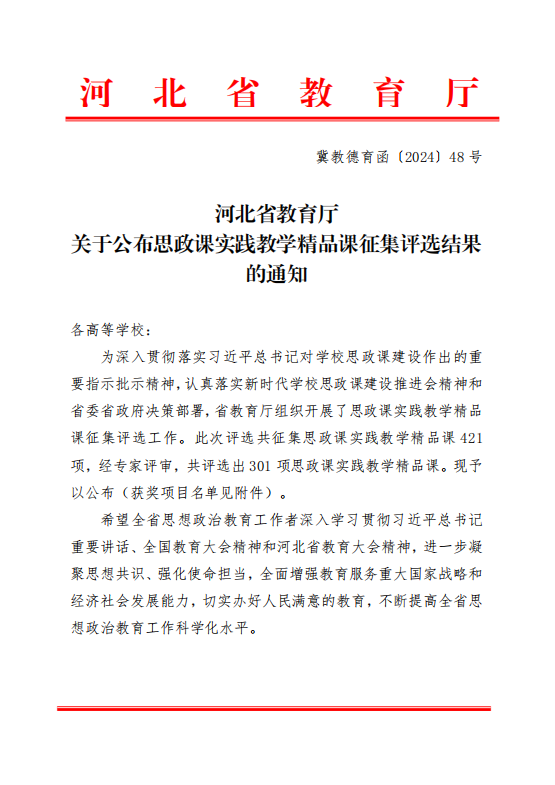近日,河北省教育厅发布了《关于公布“习近平新时代中国特色社会主义思想”精品视频课和优秀教学案例遴选结果的通知(冀教德育函〔2024〕47号)以及《关于公布思政课实践教学精品课征集评选结果的通知》(冀教德育函〔2024〕48号),学院在此次评选中共有6个作品成功入选。