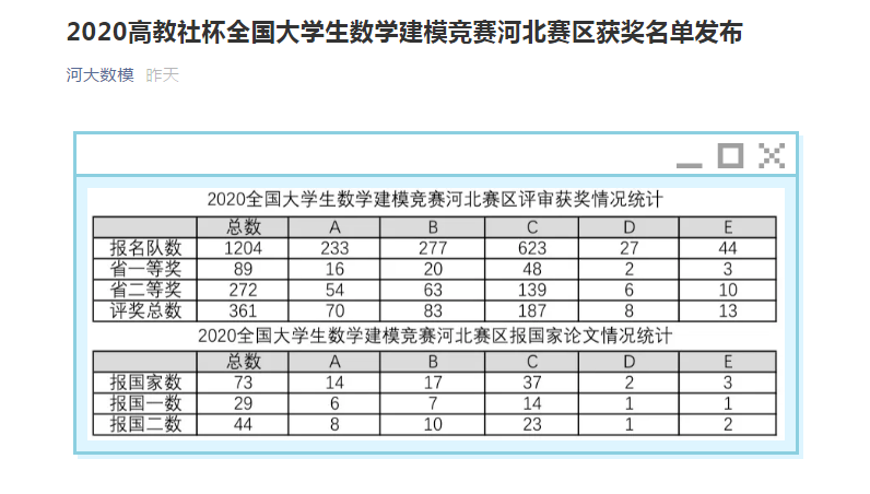 10月14日,2020高教社杯全国大学生数学建模竞赛河北赛区获奖名单发布,承德应用技术学院喜获全国大学生数学建模大赛河北赛区二等奖。