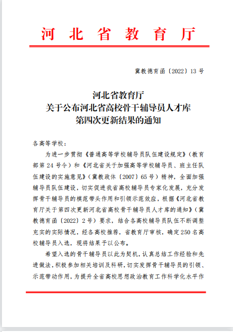 为全面加强辅导员队伍建设,切实促进高校辅导员专业化职业化发展,充分发挥骨干辅导员的模范带头作用和引领示范效应,根据《河北省教育厅关于第四次更新河北省高校骨干辅导员人才库的通知》(冀教德育函〔2022〕2号)要求,结合学院辅导员队伍实际情况,经学院推荐,省教育厅审核,确定电子与通信工程系辅导员杨春燕老师入选河北省高校骨干辅导员人才库。