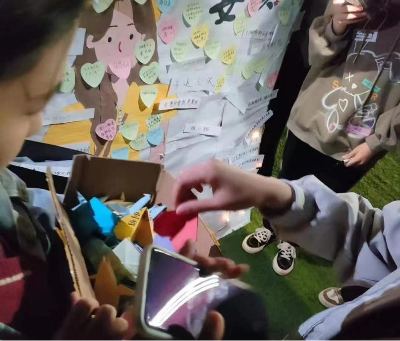 除了丰富多彩的游戏活动,田园老师带领学前教育2209班开展“做不被定义的女孩”主题活动,活动以“撕下对女孩的标签,成为更好的自己”为宣传标语。学生们在便利贴上写下自己对女孩的定义,把自己对美好未来的期许叠成祝福的千纸鹤。围观的小伙伴也收到写着暖心寄语的千纸鹤:“少女的定义从不是年轻漂亮,而是勇敢!”